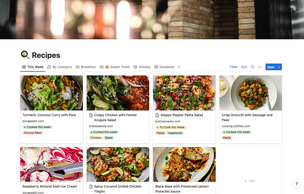 Use this Notion template to keep track of all of your favorite recipes! Categorize your recipes with tags, rate them, add notes, and highlight the recipes you'll use throughout the week to simplify meal planning.
